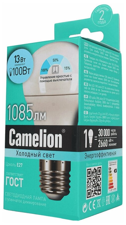 Отзывы на Электрическая лампа Camelion светодиодная со ступенчатым изменением яркости 13Вт 220В LED13-A60-D/845/E27