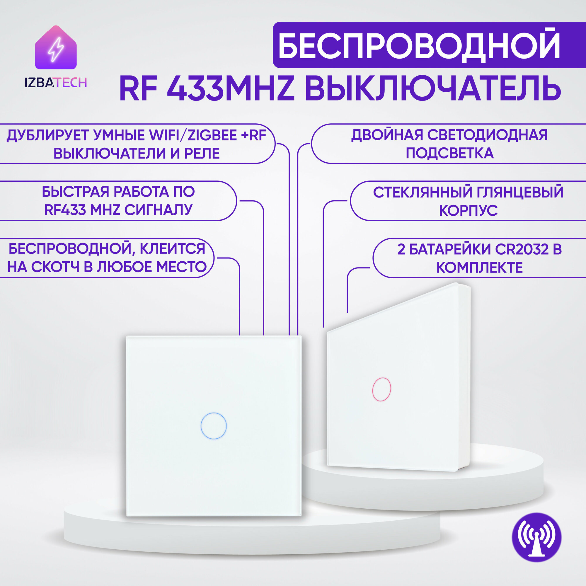 10 цен на Радио повторитель умного выключателя для Алисы RF 433 Mhz стеклянный на батарейках белый на 1 кнопку