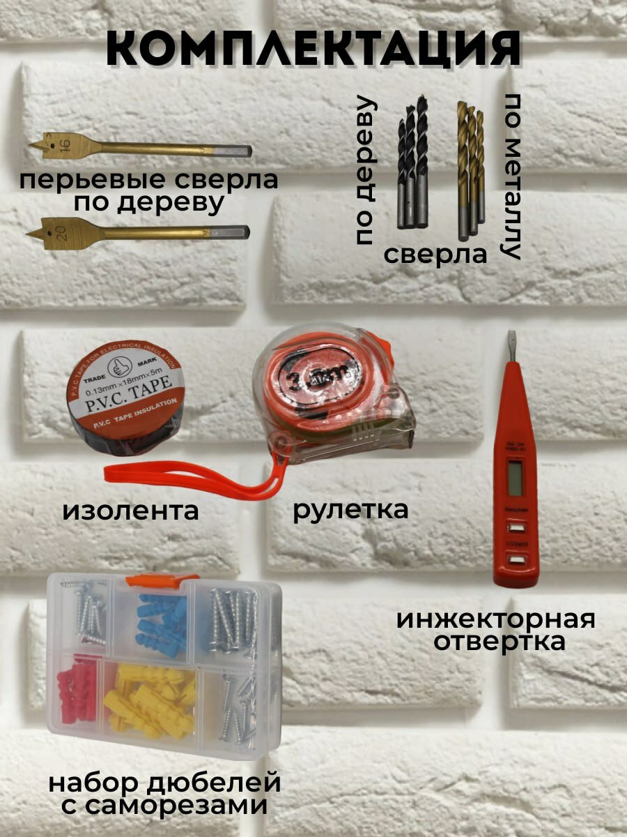 | Подробная комплектация | Шуруповерт 26V-1шт,2 аккмулятора (Li-Ion),Зардное устройство 26V-1шт,Биты-10шт,сверла по металлу и дереву -6шт,Молоток-1шт,пласкошубцы-1шт,длинногубцы-1шт,разводной ключ-1шт,Изолента-1шт,Пила-1шт,Торецевые головки-9шт,отвертка для головок-1шт,Отвертка крестообразная-1шт,Отвертка прямой шлиц-1шт,Набор дюблей и саморезов,-1шт,Рулетка(3м)-1шт,Индикаторная отвертка-1шт,Перьевыее сверла по дереву, Канцелярский нож-1шт,Запасаные лезвия-5шт,Отвертки малые-4шт,Ударопрочный кейс-1шт |
