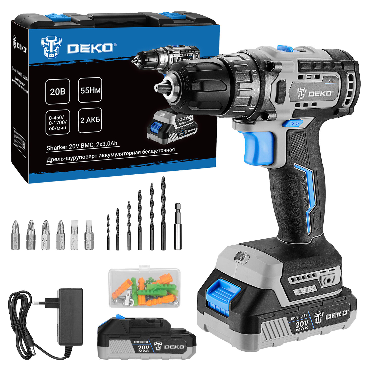 | Подробная комплектация | 1 шт дрель аккумуляторная DEKO Sharker 20V 2 шт аккумулятор 1 шт зарядное устройство 6 шт сверла: 2,2,5,3,4,5,6 мм 6 шт биты: SL4,6, PH1,2, PZ1,2 1шт 60мм магнитный держатель бит 1шт руководство по эксплуатации 1шт кейс |