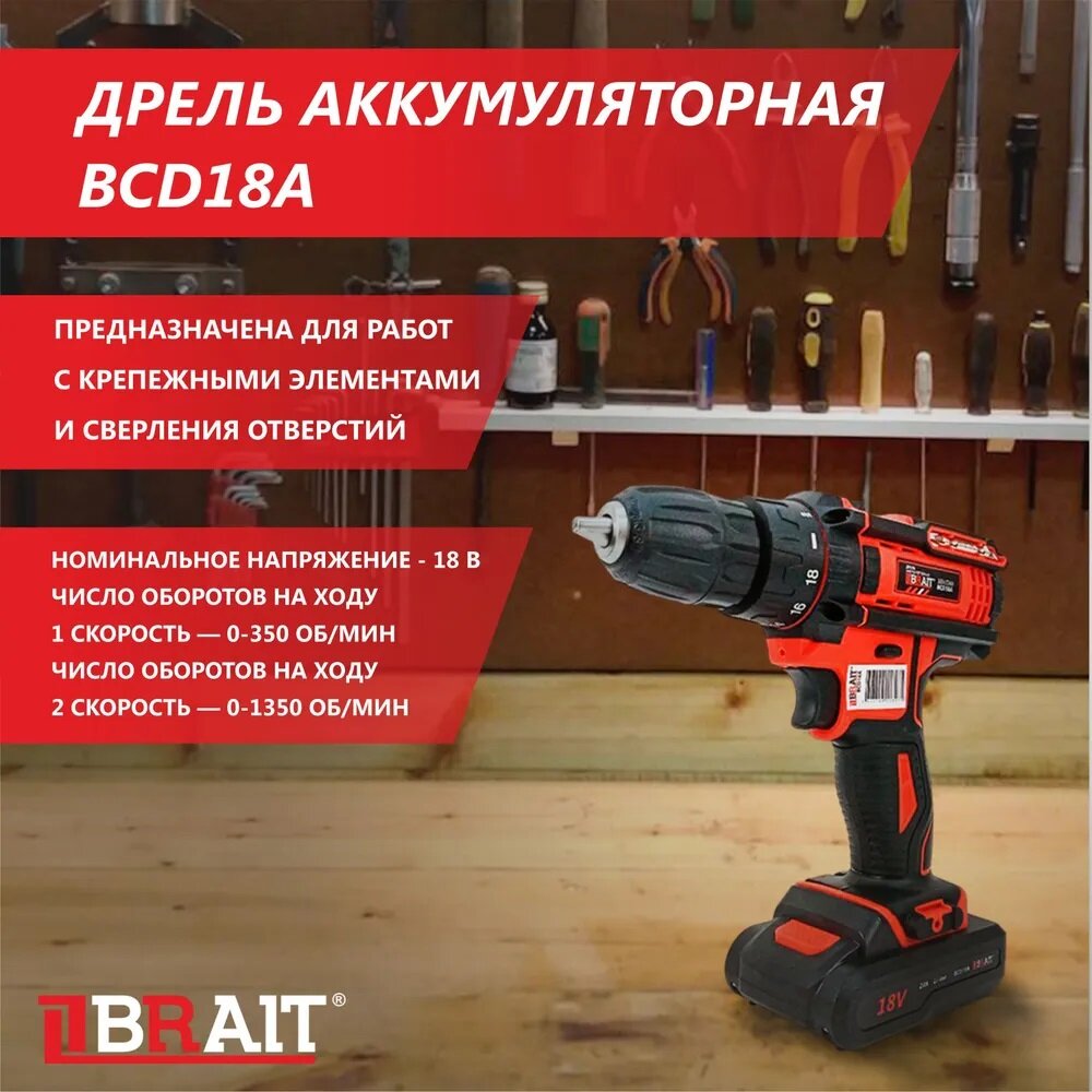 Дрель-шуруповерт аккумуляторная Brait BCD18A (18В Li-on; 2 акк., 2Ач, 30Нм; кейс с набором бит) информация: