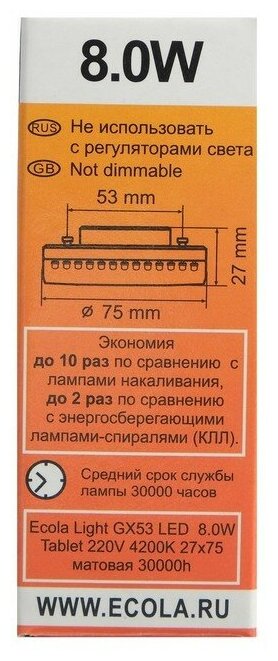 Ecola Лампа светодиодная Ecola, GX53, 8 Вт, 4200 K, 27x75 мм, матовое стекло информация: