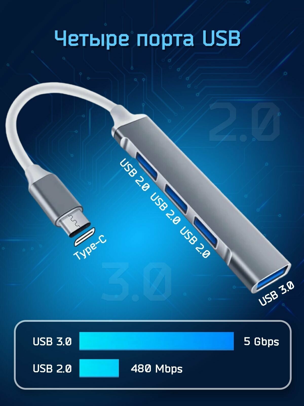 USB-хаб Разветвитель Type-C с 4 портами USB 3,0, USB 3,0, 5 Гбит/с серый металлик