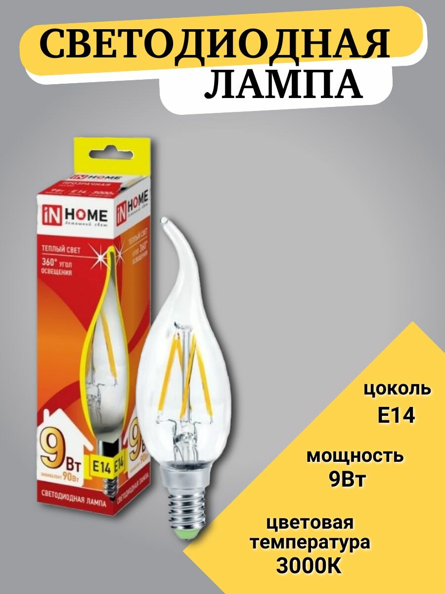 Отзывы на IN HOME Лампа сд led-свеча на ветру-deco 9Вт 230В Е14 3000К 810Лм прозрачная 4690612026220
