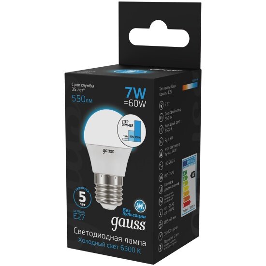 Светодиодная лампа Gauss Шар 7W 550lm 6500K Е27 шаг. диммирование LED 1/10/100 информация: