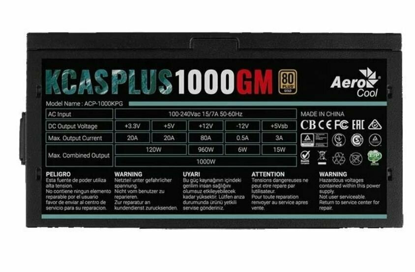 Блок питания Aerocool ATX 1000W KCAS PLUS 1000GM V2 (24+8+4+4pin) APFC 140mm fan 10xSATA Cab Manag R информация: