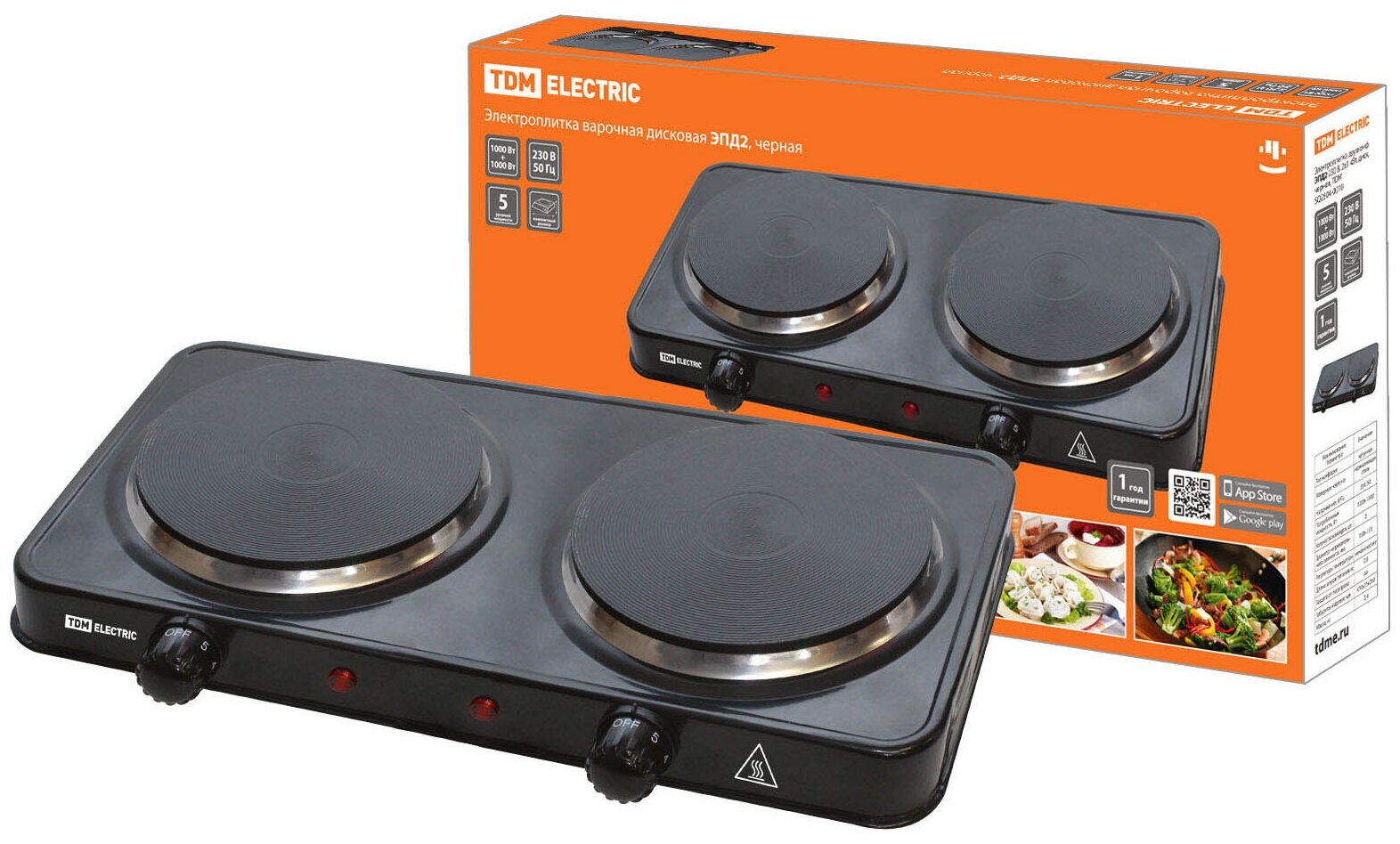 TDM Электроплитка ЭПД2, 2 конфорки, диск, 1кВт+1кВт, черная, SQ2504-0010