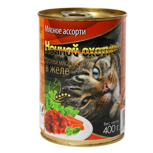 Консервированный корм Ночной охотник, мясное ассорти кусочки в желе, 415 гр х 20шт.