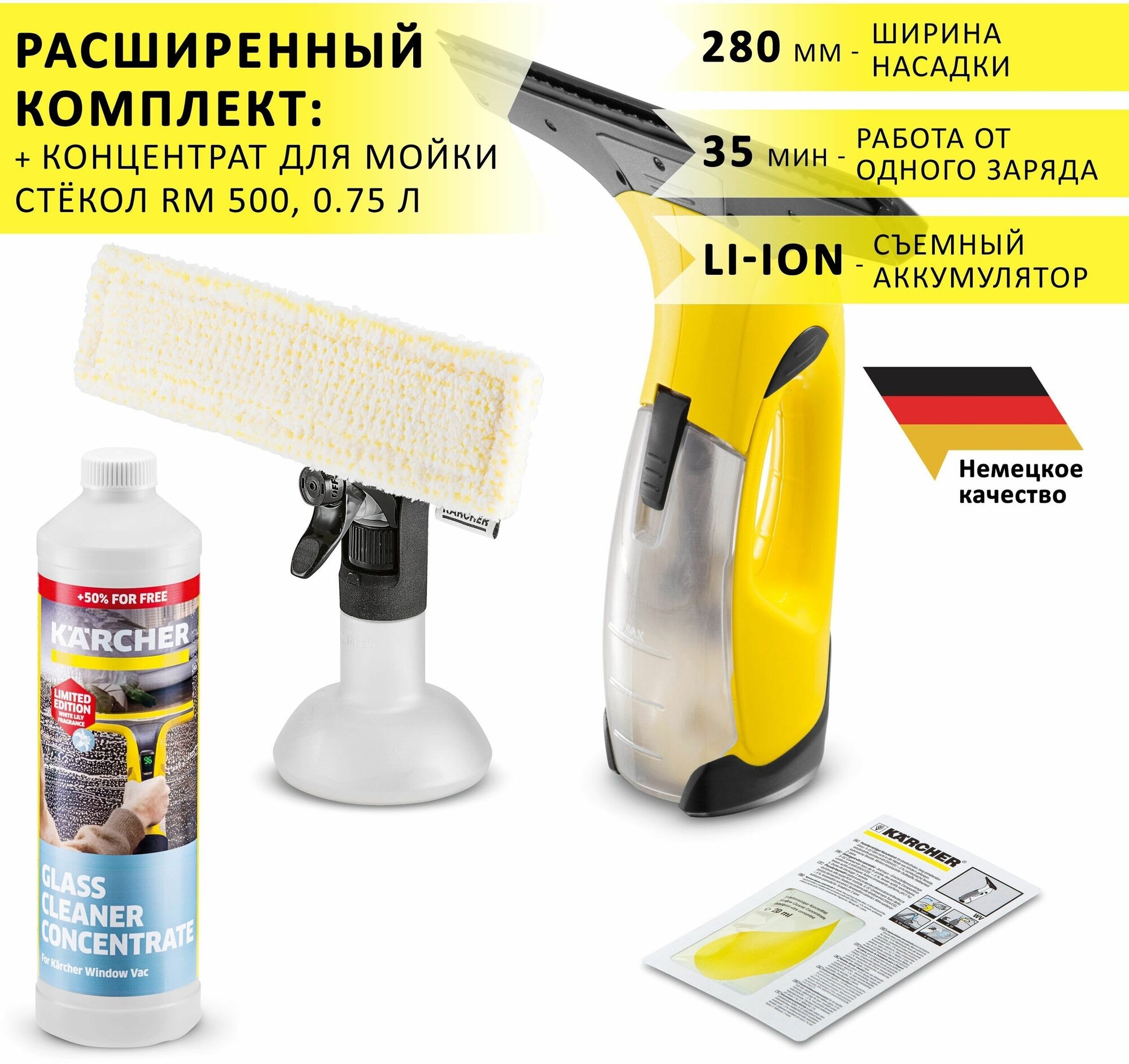 Стеклоочиститель электрический (мойщик окон) Karcher WV 2 Plus, аккумуляторный + концентрат для мойки стекол RM 500, 0.75 л информация: