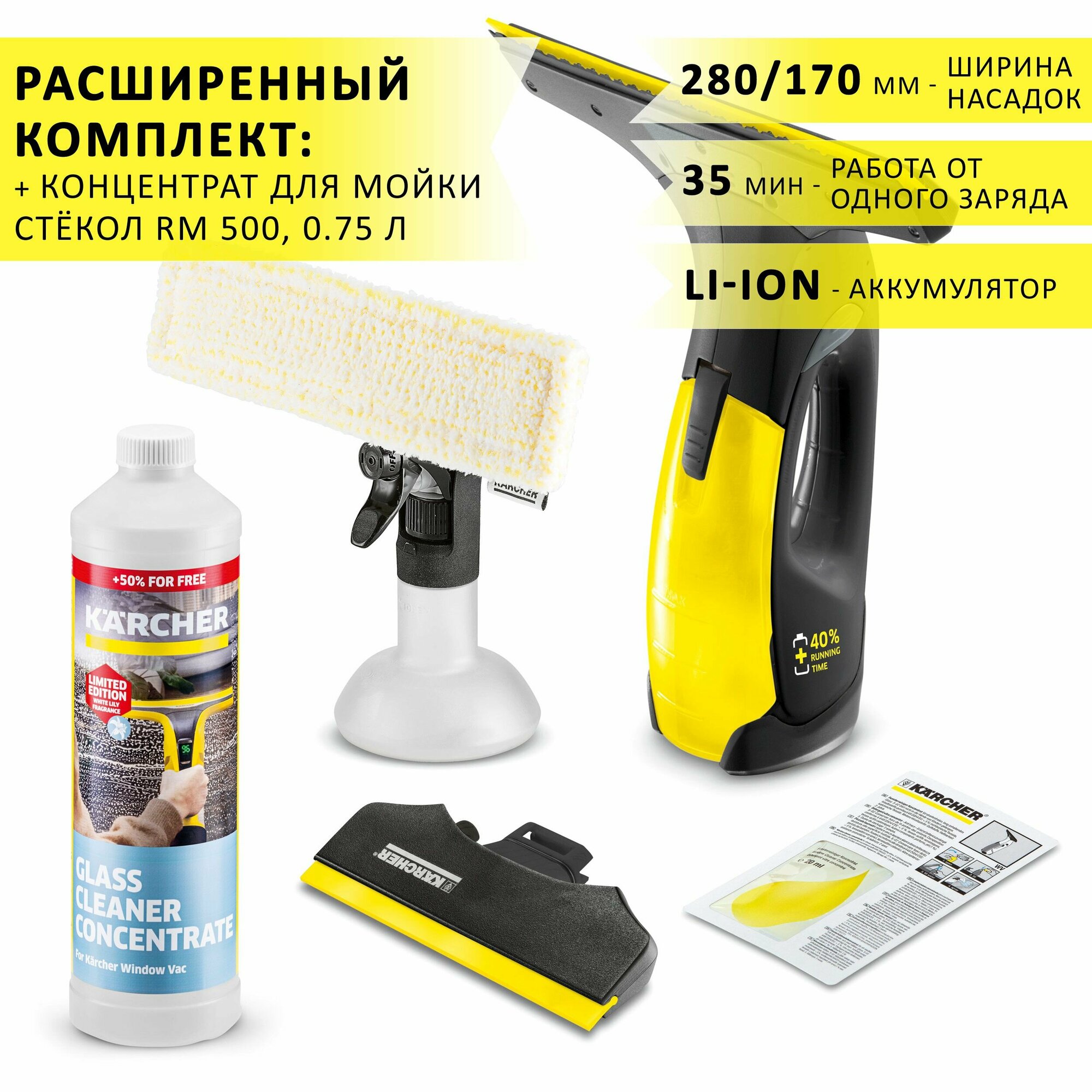 10 цен на Стеклоочиститель электрический (мойщик окон) Karcher WV 2 Black Edition, аккумуляторный + концентрат для мойки стекол RM 500, 0.75 л