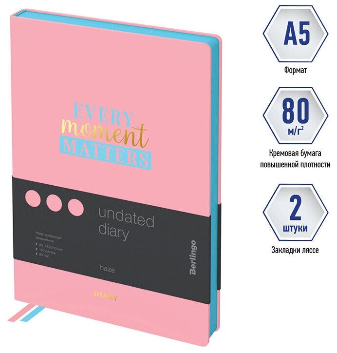 Ежедневник недатированный Berlingo А5, 160 листов, Haze, голубой срез, розовый, с рисунком информация: