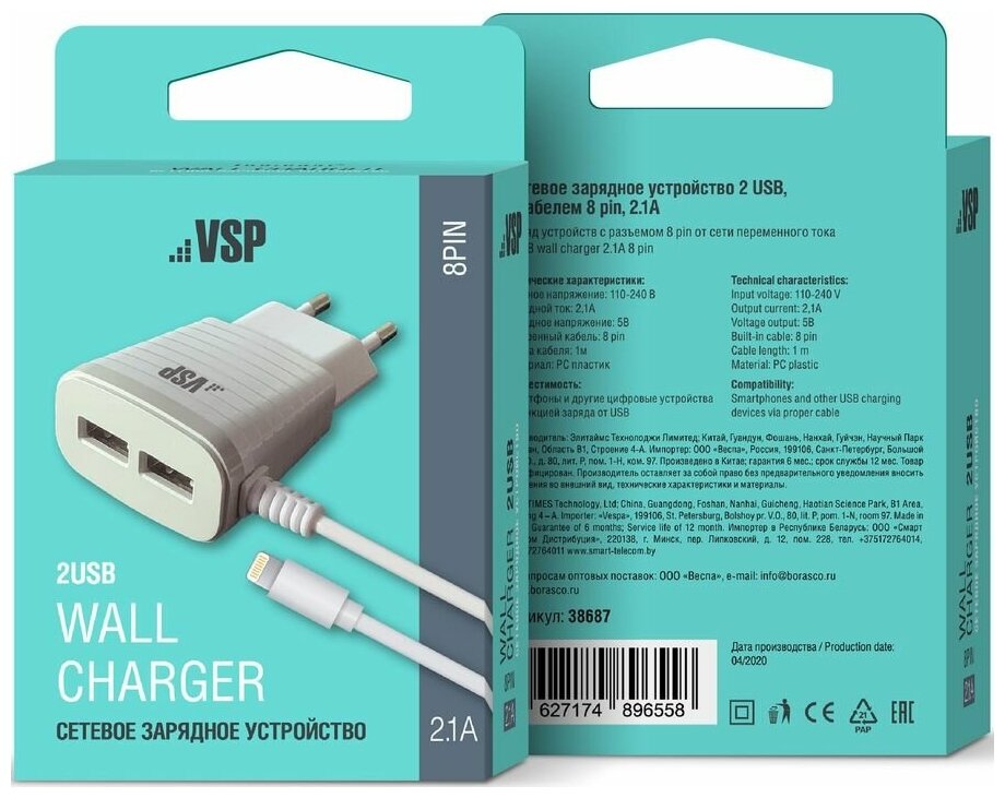 Отзывы на Сетевое зарядное устройство BORASCO 38687, 8 pin lightning, 2xUSB, 8-pin Lightning (Apple), 2.1A, белый