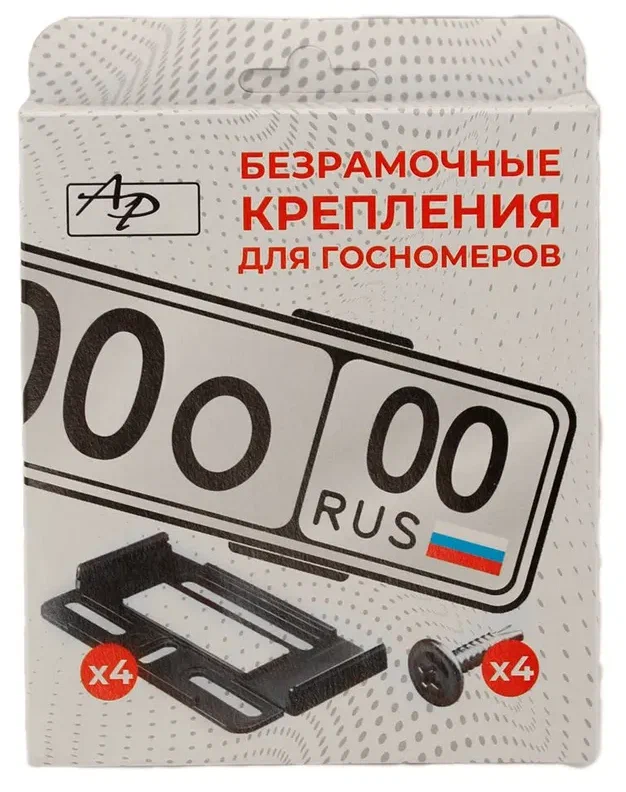 Комплектация | Крепления для 2х номеров автомобиля - 4 шт. Саморезы из нержавеющей стали - 4 шт. |