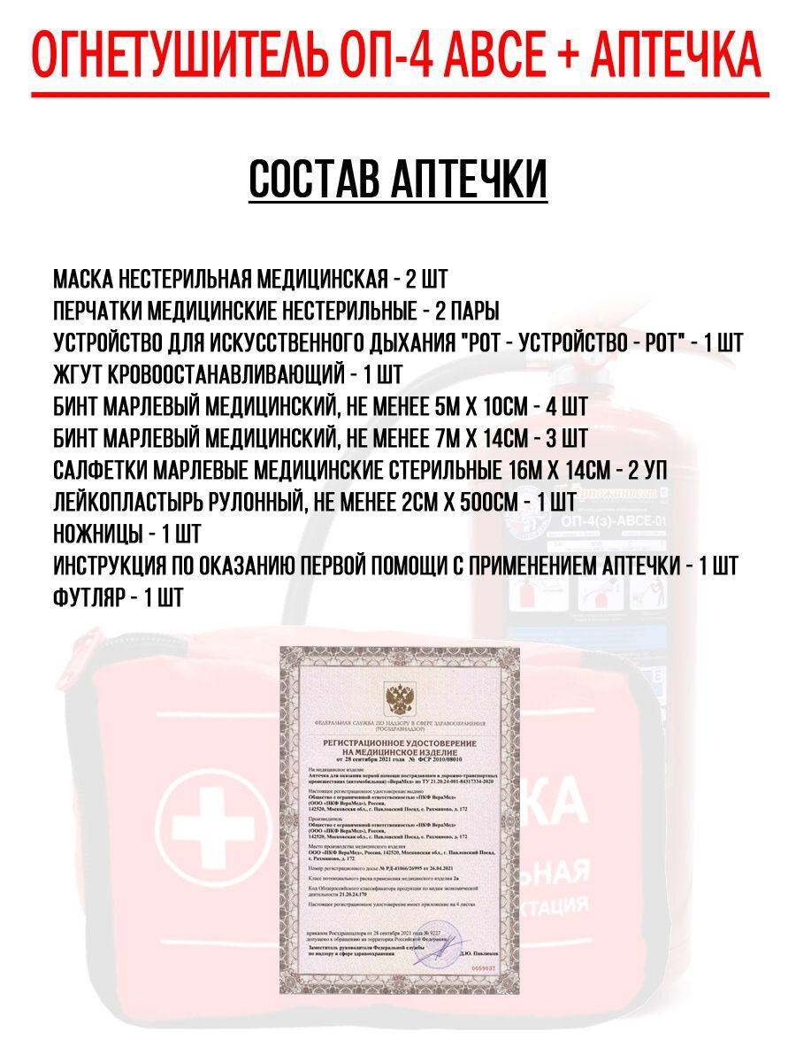 Набор автомобилиста с огнетушителем ОП-4 АВСЕ 2023 и Аптечка автомобильная ГОСТ информация: