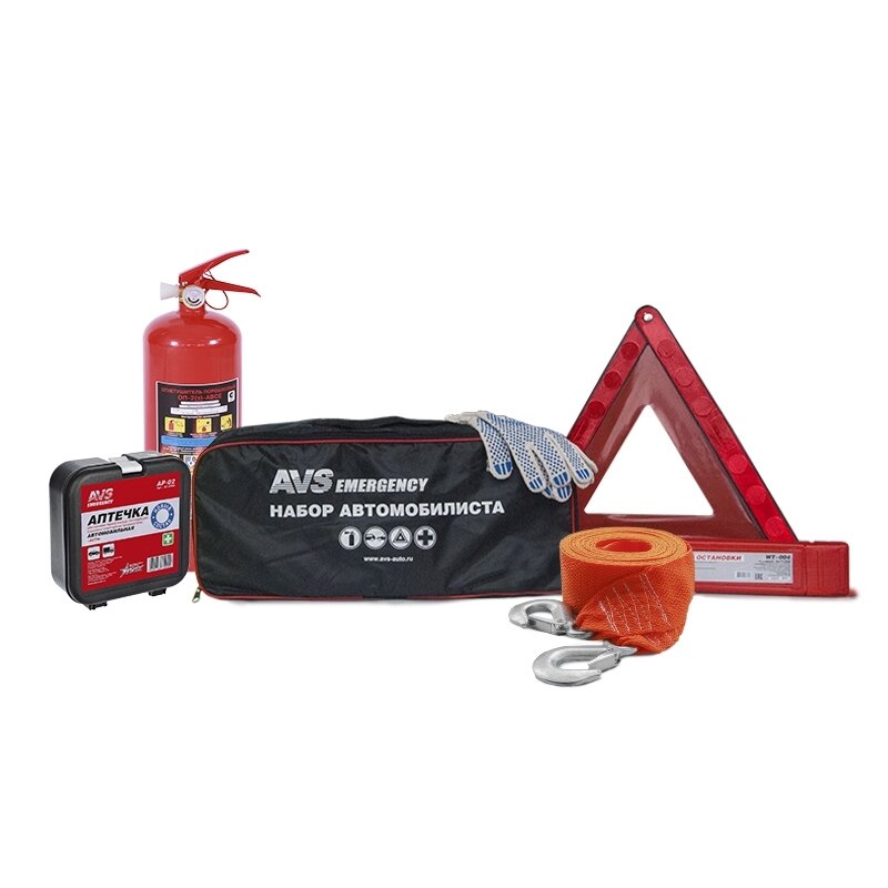 | Подробная комплектация | 1. Сумка "Набор автомобилиста" AVS SN-01 2. Аптечка автомобильная (по приказу) AVS AP-02 (Комплектация аптечки соответствует приказу № 1080н от 08.10.2020 Министерства здравоохранения Российской Федерации) 3. Знак аварийной остановки модель AVS WT-004 4. Трос буксировочный с крюками AVS ET-5S, 5 тонн, 4.5 м, в пакете 5. Перчатки ХБ с ПВХ (белые) 7,5 класс 1 пара AVS RP-01 6. Огнетушитель ОП-2 (ABCE) |