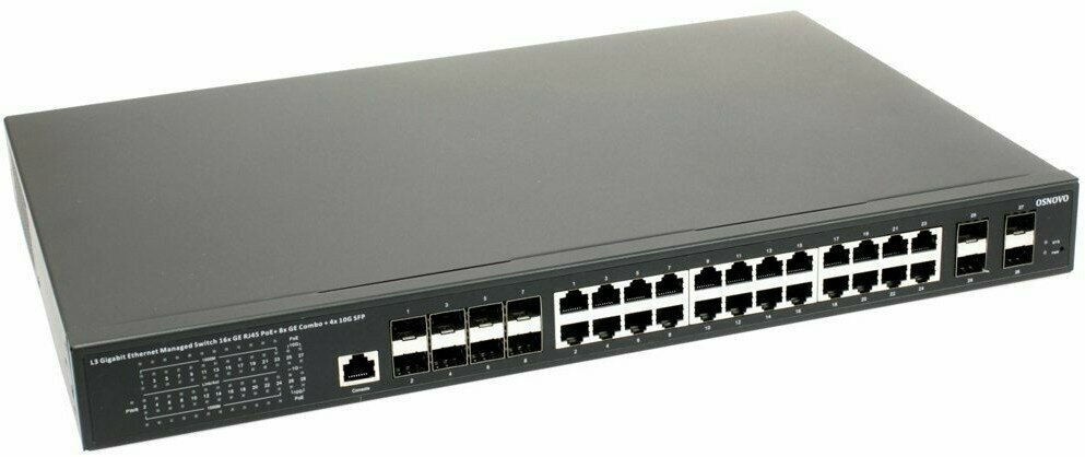 Коммутатор/ OSNOVO Управляемый L3 коммутатор Gb Ethernet на 16xGE RJ-45 + 8xGE Combo (RJ-45 + SFP) + 4x10G SFP+ Uplink. Уровень управления L3 (Full managed), 19" крепление в комплекте. Встроенная грозозащита 3kV.