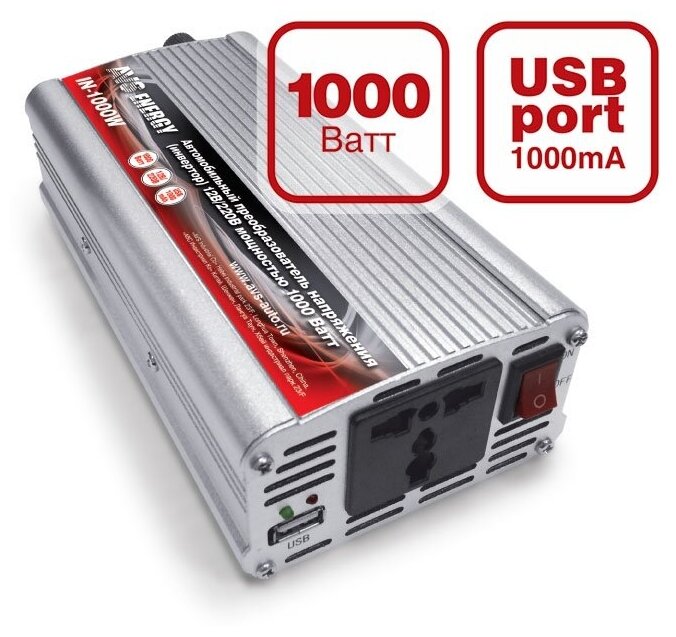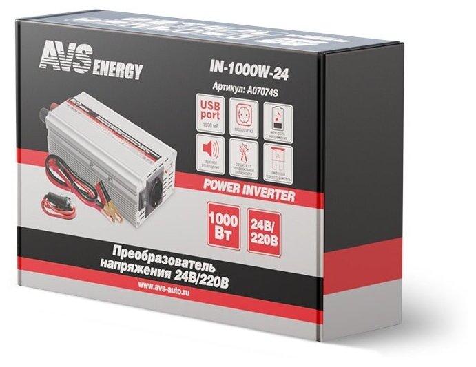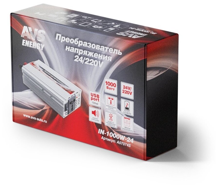 Преобразователь напряжения автомобильный AVS IN-1000W-24 (24В > 220В, 1000 Вт, USB) информация: