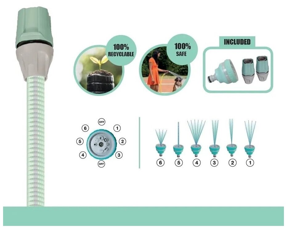 | Комплектация | шланг, два коннектора, насадка-распылитель с 6 функциями, настенная катушка |