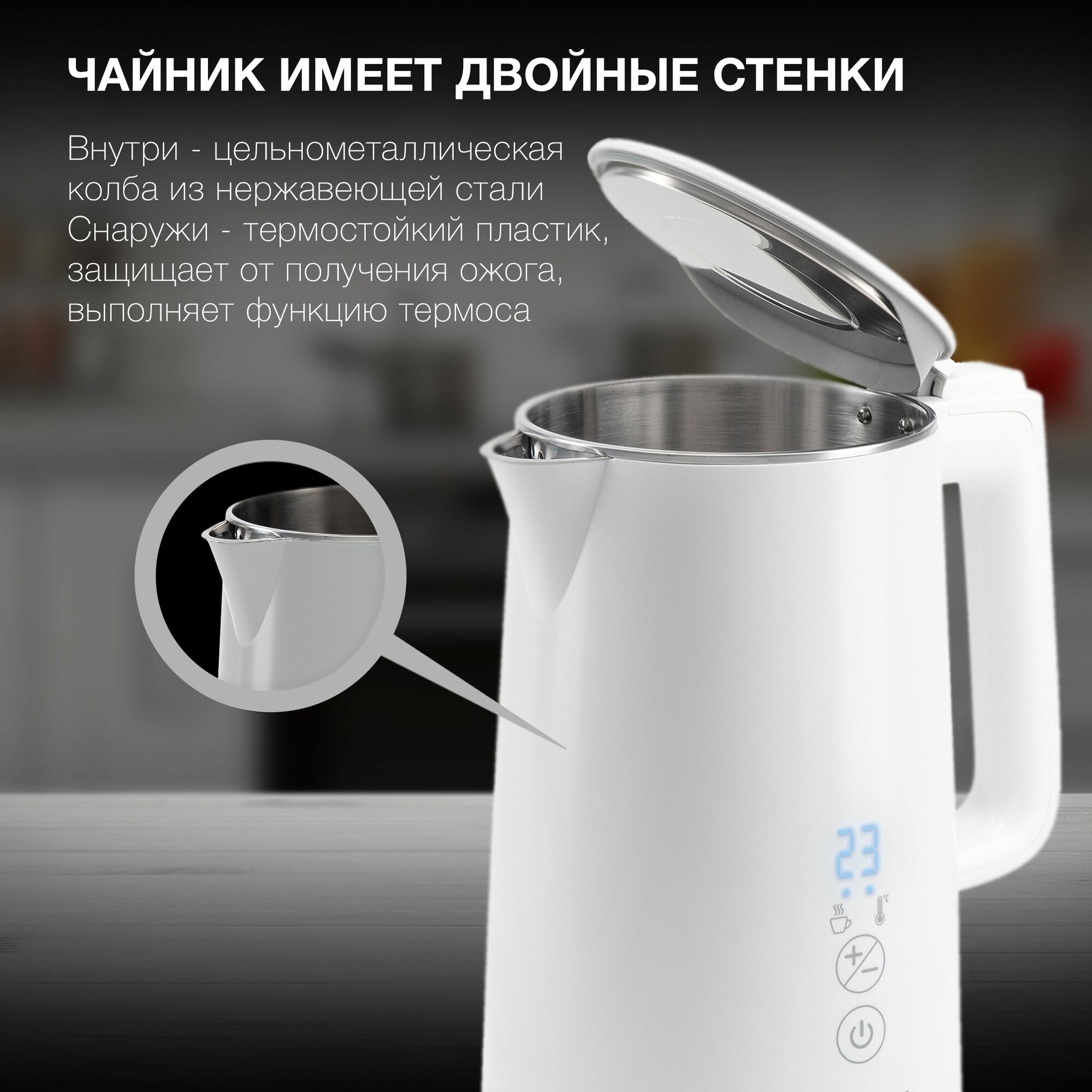 | Особенности | вращение на 360 градусов / двойные стенки / дисплей / индикатор уровня воды / индикация включения / отсек для хранения шнура / сенсорное управление / фильтр |
