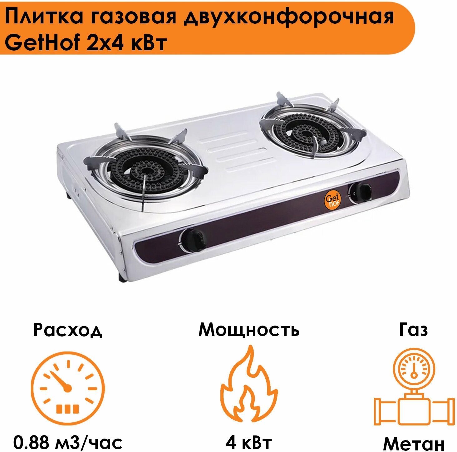 Плитка газовая настольная двухконфорочная GetHof 2x4 кВт GT-4M2K (метан) информация: