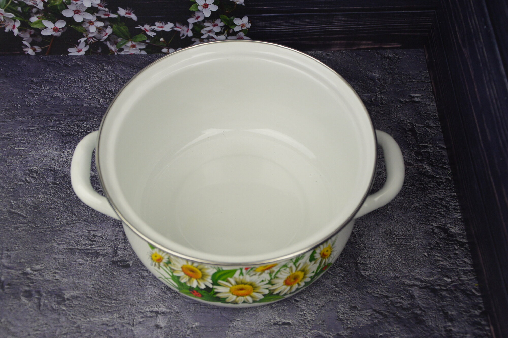 Кастрюля эмалированная 1,5 л с ободком белая с рисунком Фруктовая фантазия