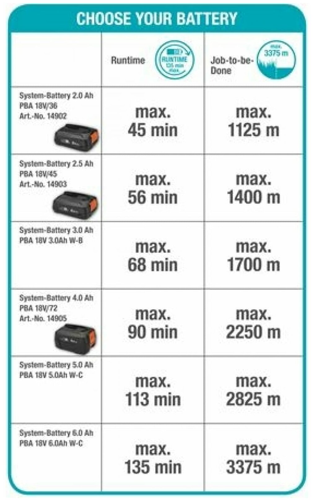 | Подробная комплектация | Аккумуляторный триммер Аккумулятор P4A PBA 18V/36 Зарядное устройство P4A AL 1810 CV 5 ножей RotorCut Инструкция Упаковка |