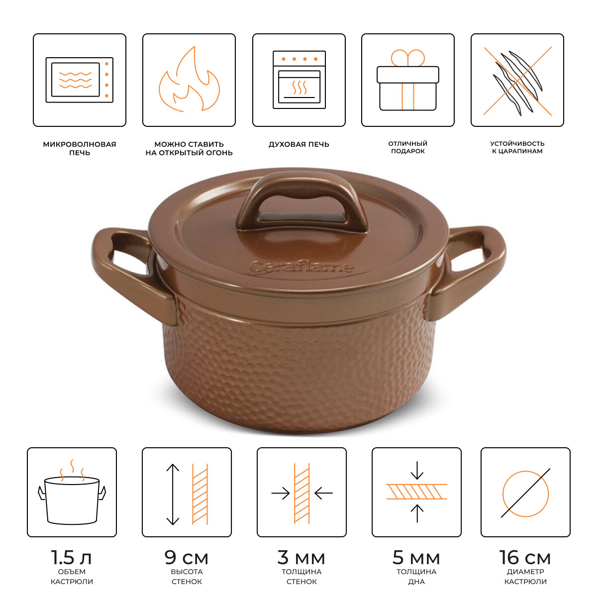 Кастрюля керамическая с крышкой Ceraflame Hammered 16 см, 1.5 л, медный информация: