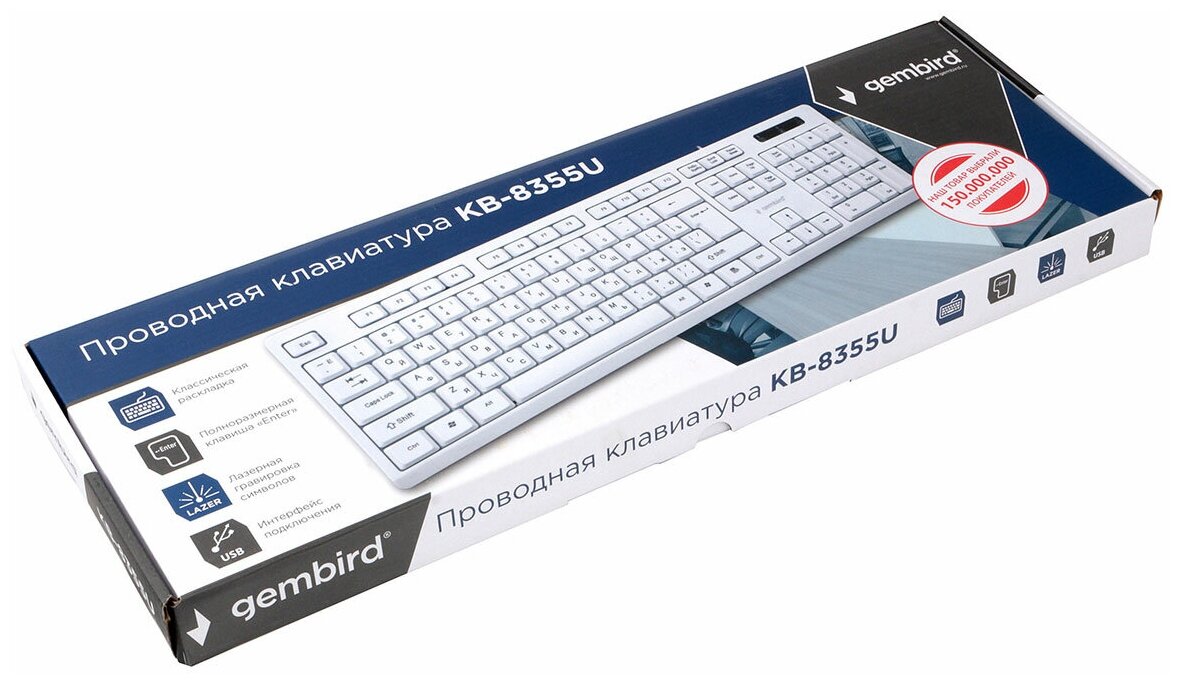 Клавиатура Gembird KB-8355U, USB, белый, лазерная гравировка символов, кабель 1,85м