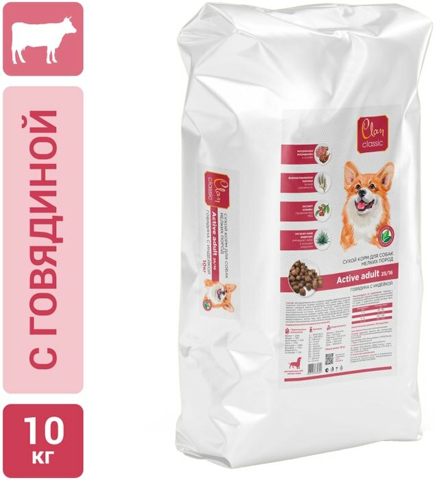 Корм Clan Classic Active 25/16 для активных собак малых пород, с говядиной и индейкой, 10 кг информация:
