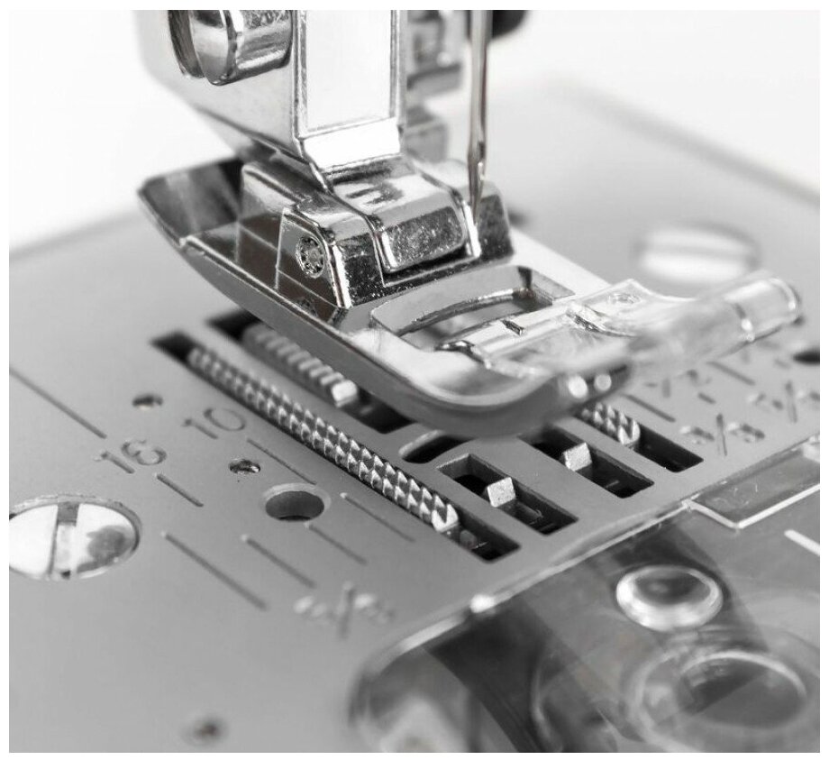 | Дополнительная информация | Запатентованная система заправки верхней нити DQS: благодаря ей достаточно провести нить от катушки до иглы через единственный паз в корпусе и заправить нить в иглу, используя встроенный нитевдеватель. |