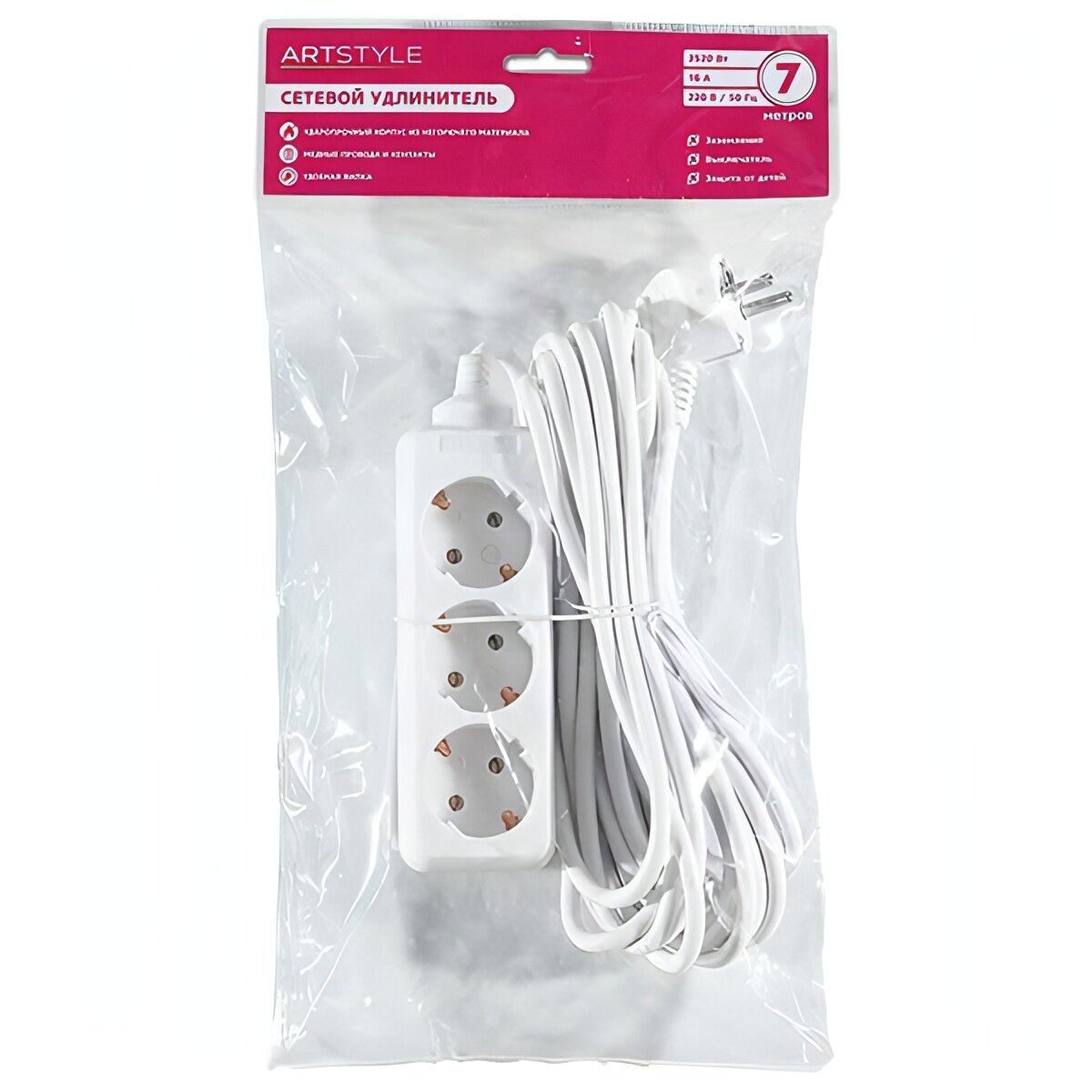 ARTSTYLE Сетевой удлинитель CL-C37GW белый, 3 гнезда, длина провода 7м, 220В, 16А, с заземлением, без выключателя 790 ₽