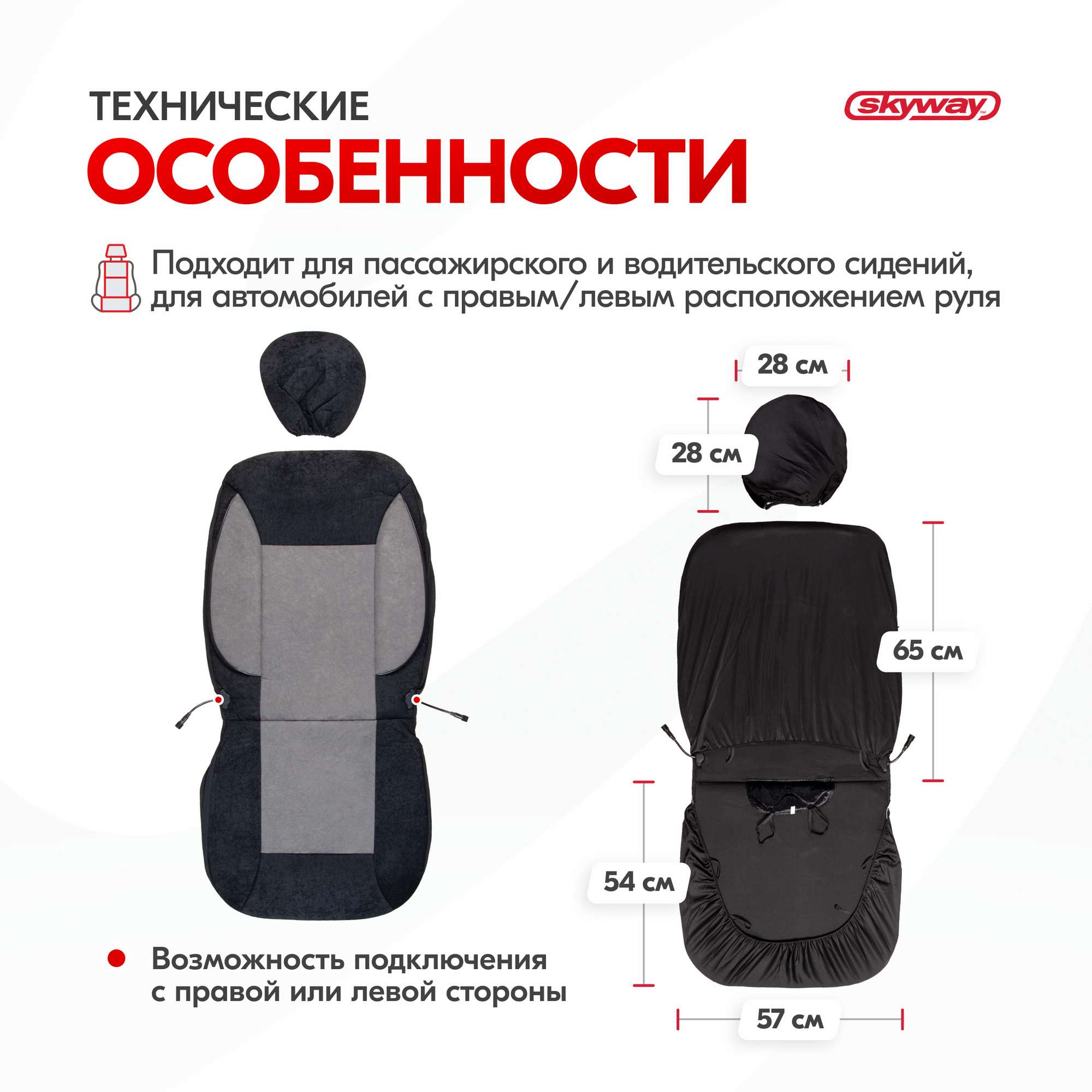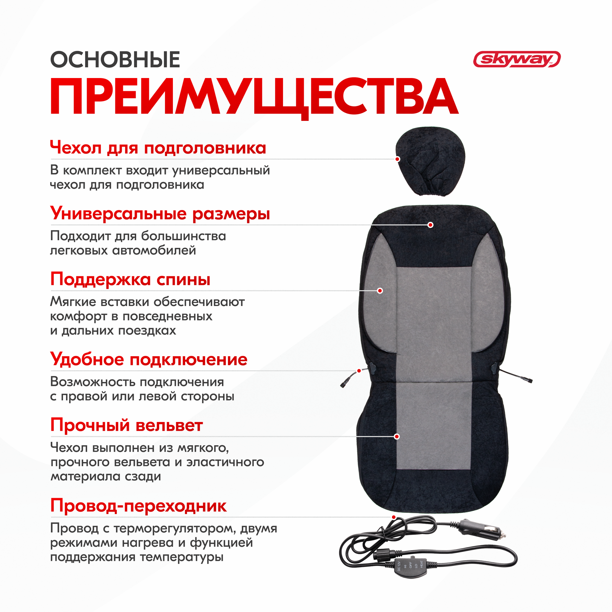 Чехол сиденья с подогревом вельвет ТМ Skyway SKYWAY с терморегулятором (2 режима) Черный с боковой поддержкой спины 12V 116х56см 2,5А-3А (2 шнура: справа, слева) 3 350 ₽