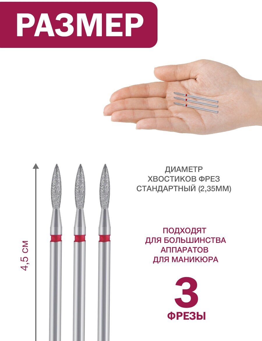 Фрезы алмазные для маникюра и педикюра пламя 3 шт 2,3 мм набор для профессионального маникюрного аппарата, дизайна, полировки ногтей, кожи и кутикулы