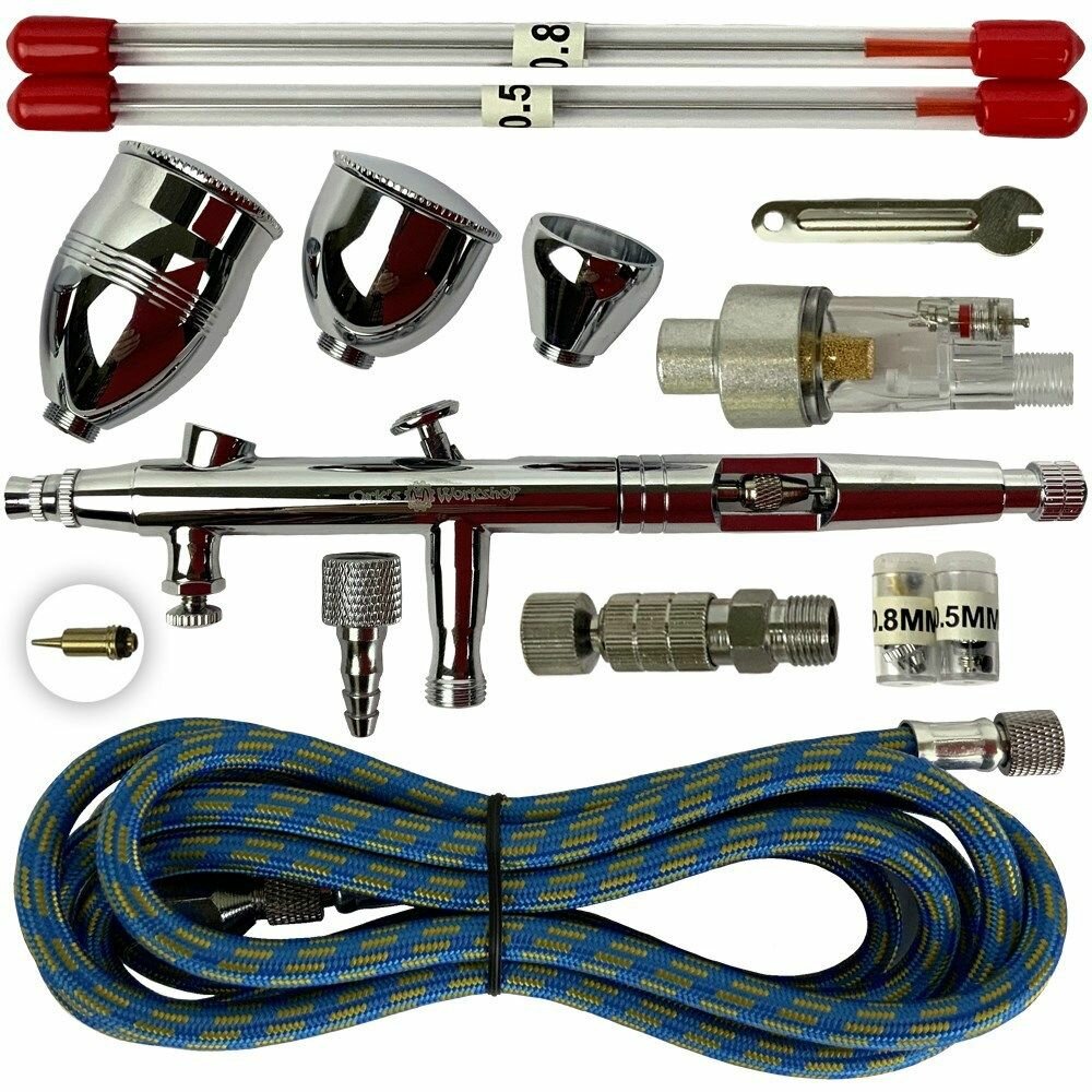 | Комплектация | Аэрограф, Бачок 2 мл, Бачок 5 мл, Бачок 13 мл, Cопло и Игла 0,2 мм, Cопло и Игла 0,5 мм, Фильтр, Пипетка, Ключ для смены сопла, Шланг 1,8 м с двумя выходами G1/8, Переходник G1/8- G1/4 |