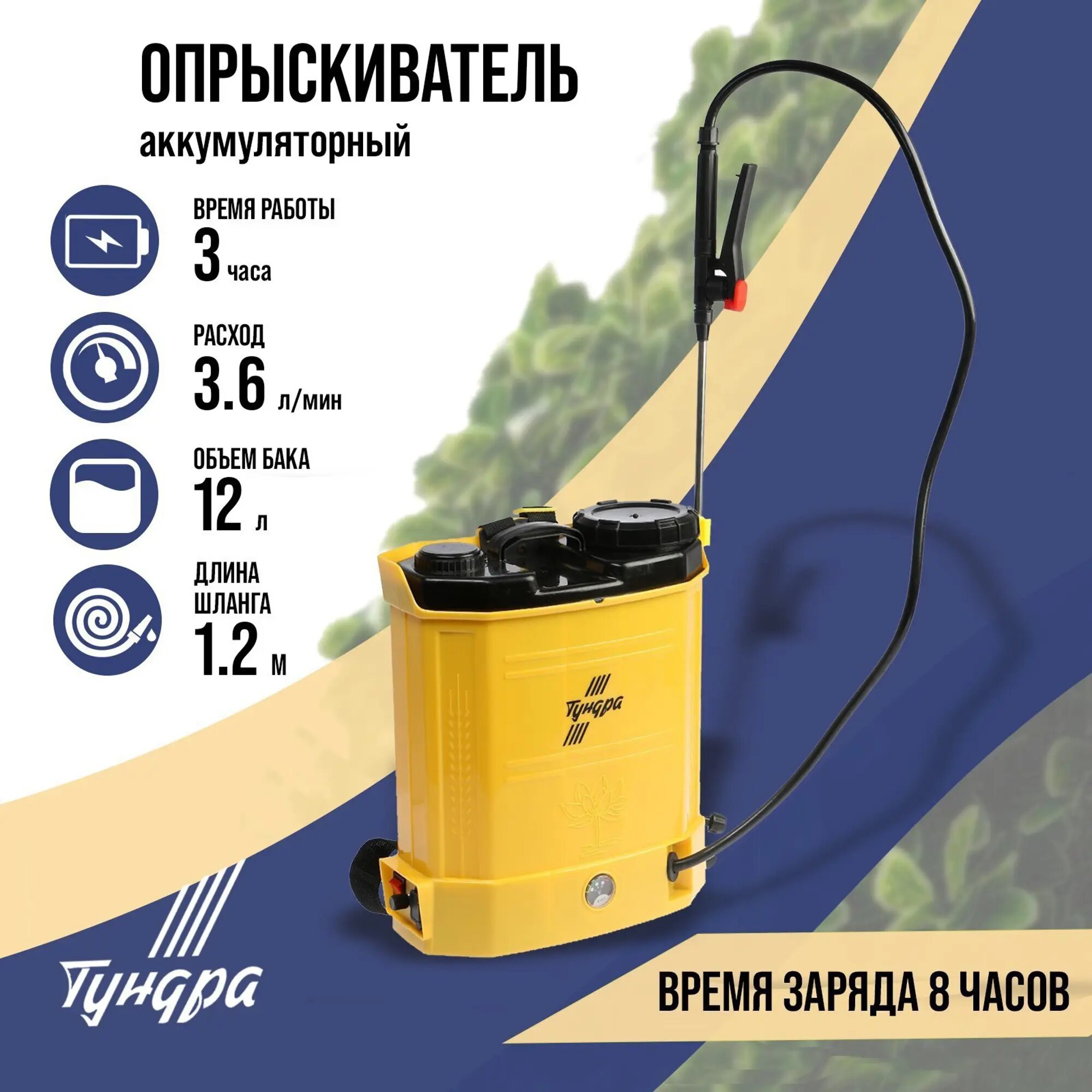 Опрыскиватель аккумуляторный Тундра , 12В, 8 Ач, 12 л, индикатор заряда, 3 насадки 9194164 информация: