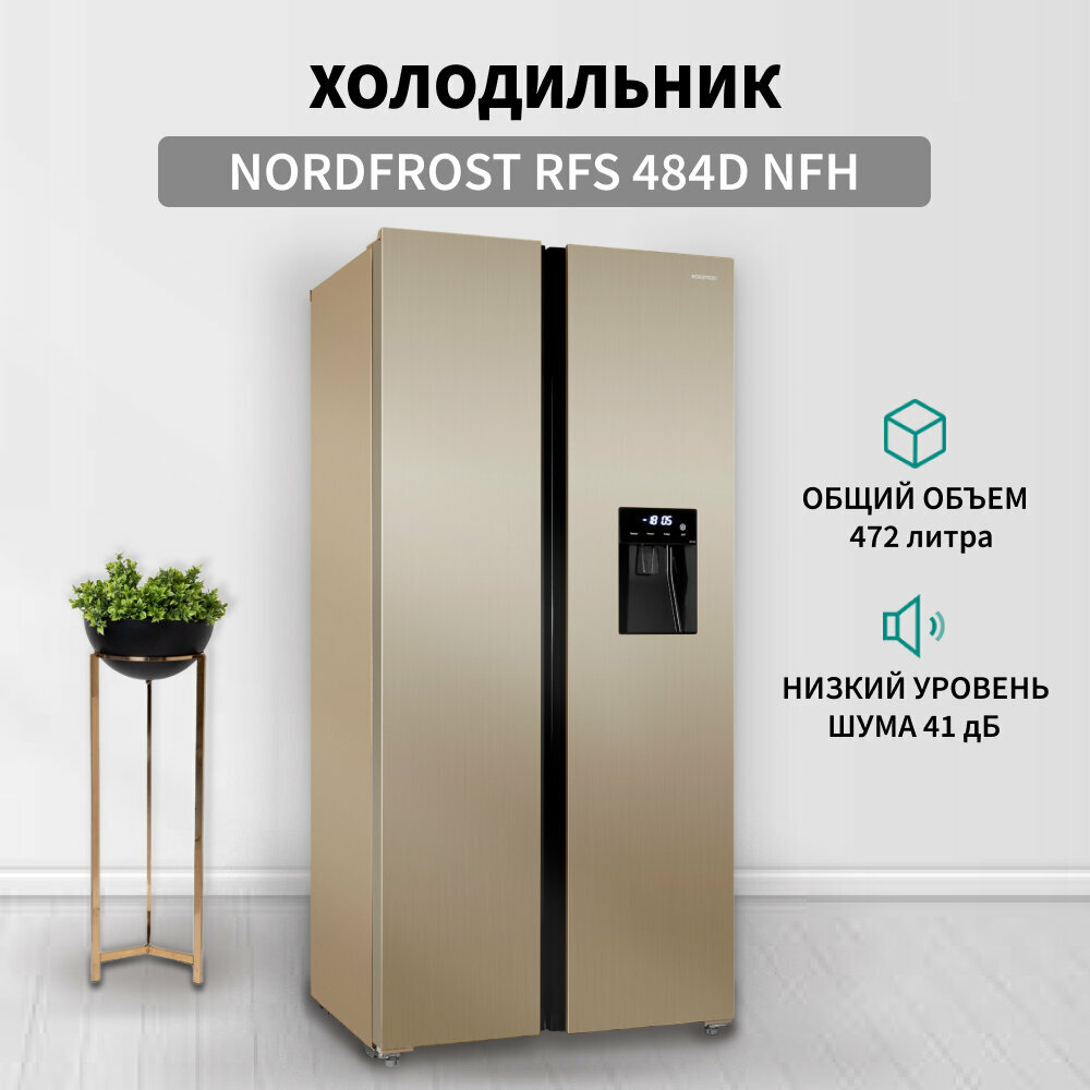 Холодильник NORDFROST RFS 484D NFH, INVERTER, Total No Frost; Side-by-side, 472 л, Класс A++, Диспенсер на двери, Ледогенератор механический поворотный,LED освещение, Электронный дисплей, Режимы «Суперзаморозка» и «Суперохлаждение»