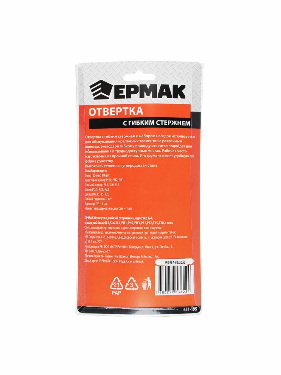 Отзывы на Отвертка 13 предметов, Ермак, сталь, гибкий стержнень, адаптер 1/4", биты: SL5, SL6, SL7, PH1, PH2, PH3, PZ1, PZ2, T15, T20, 651-195