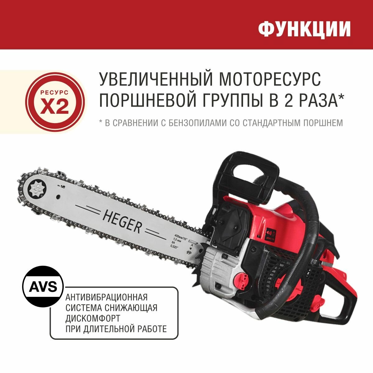 | Дополнительная информация | Благодаря высоким требованиям к производству, бензопилы HEGER обладают рядом технических преимуществ и не уступают аналогичным пилам в том же классе. Система облегченного запуска на 60% уменьшает прилагаемое при запуске усилие; Антивибрационная система снижающая дискомфорт при длительной работе; Автоматическая система подачи смазки на цепь (с возможностью регулировки); Дополнительная безопасность оператора обеспечивается уловителем цепи; Ручной насос "праймер" позволяет обеспечить быстрый и легкий запуск; Фильтр многоразового использования продлит срок службы вашей бензопилы; Цельнолитая ведущая звезда привода цепи увеличивает срок службы пилы; Хромированная поршневая система обеспечивает увеличение ресурса двигателя в 2 раза. |