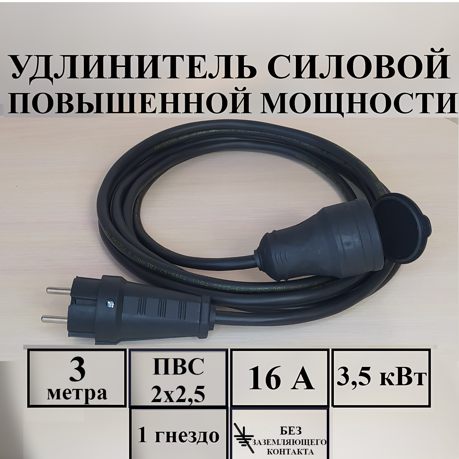 Удлинитель-шнур силовой электрический 3 м, 1 гн, 16 А, 3,5 кВт, ПВС 2х2,5 без з/к информация: