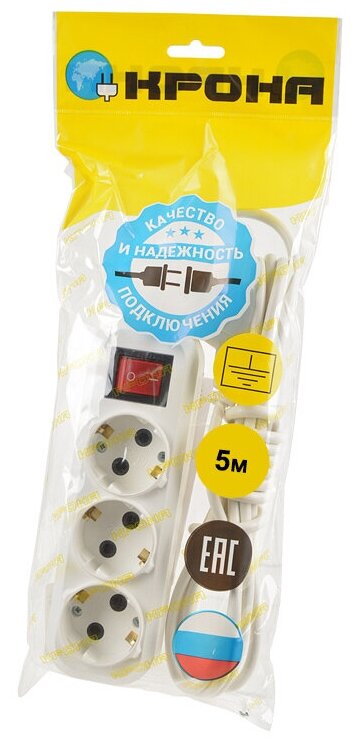Бытовой удлинитель с заземлением и выключателем крона КБ335005-Б РС (У16-001УХЛ4) 5м (ПВС 3х0,75) информация: