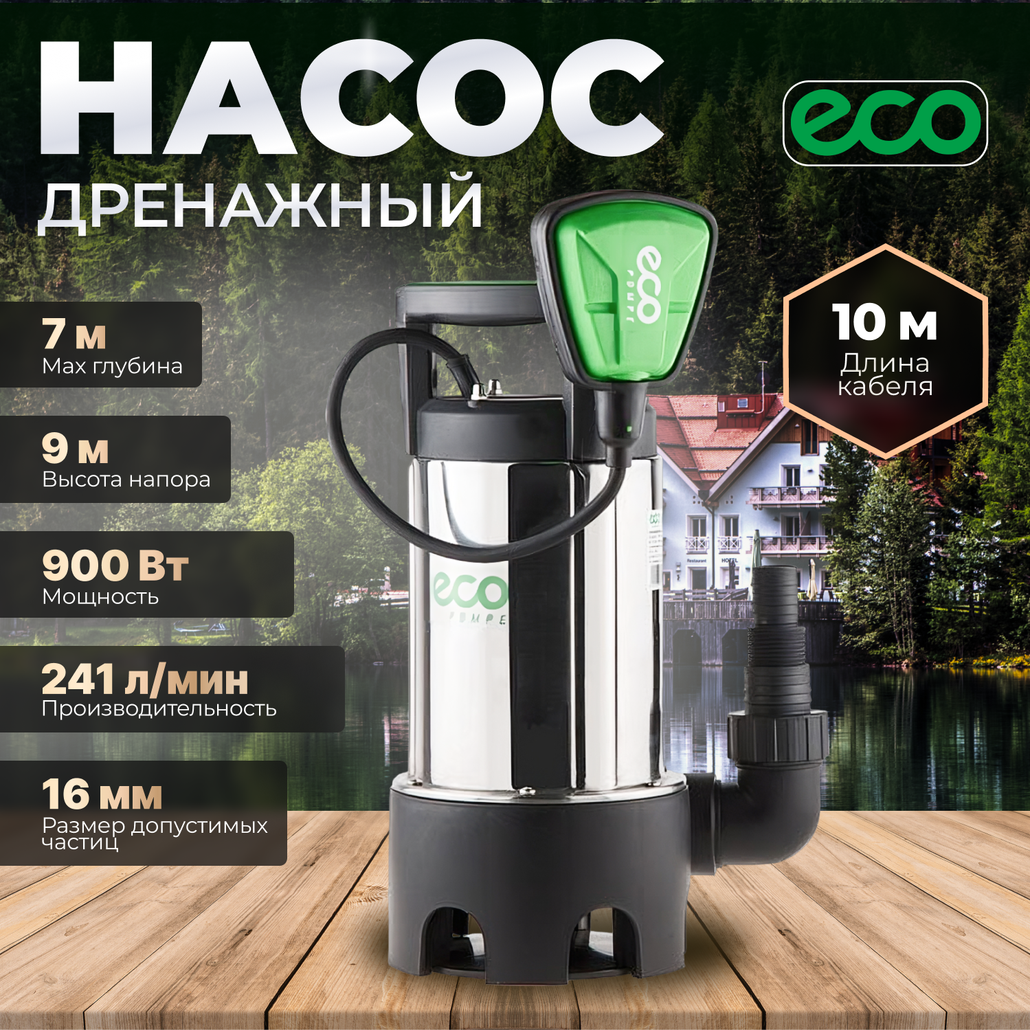 Насос дренажный для грязной воды ECO DI-903, 900 Вт, 14500 л/ч, 9 м