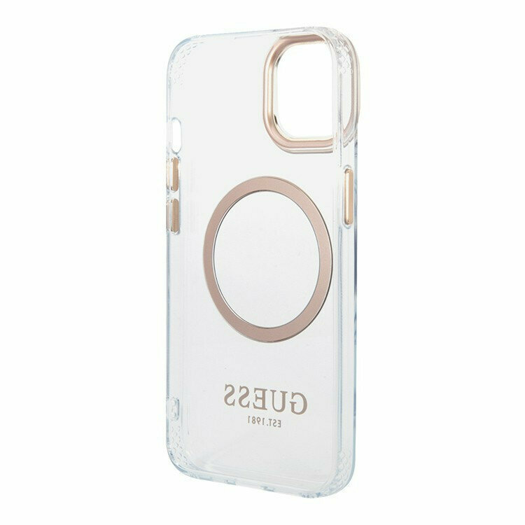 Guess для iPhone 14 чехол PC/TPU Metal outline Hard Transparent/Gold (Magsafe)