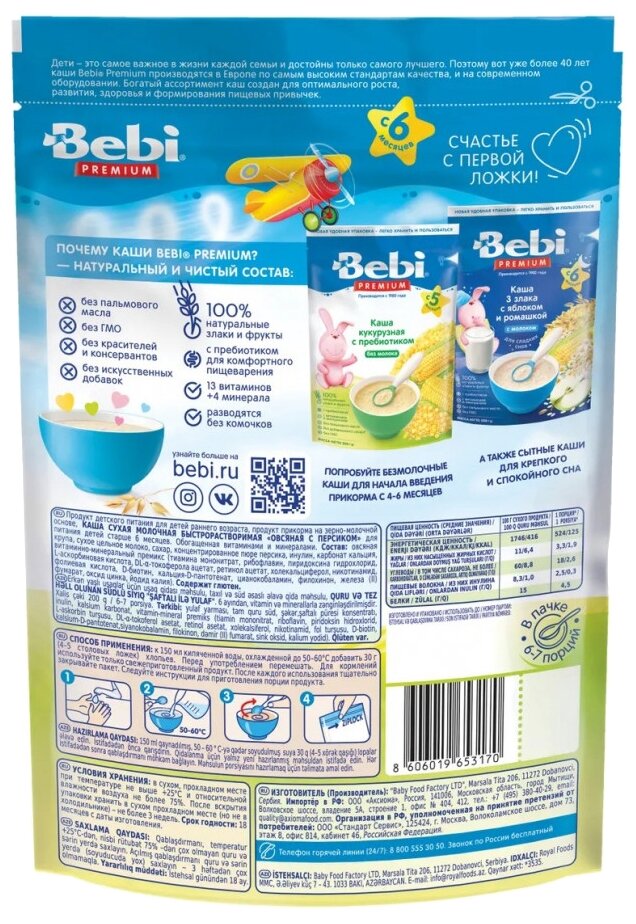 Каша беби премиум 200 г молочная овсяная с персиком с 6 месяцев информация: