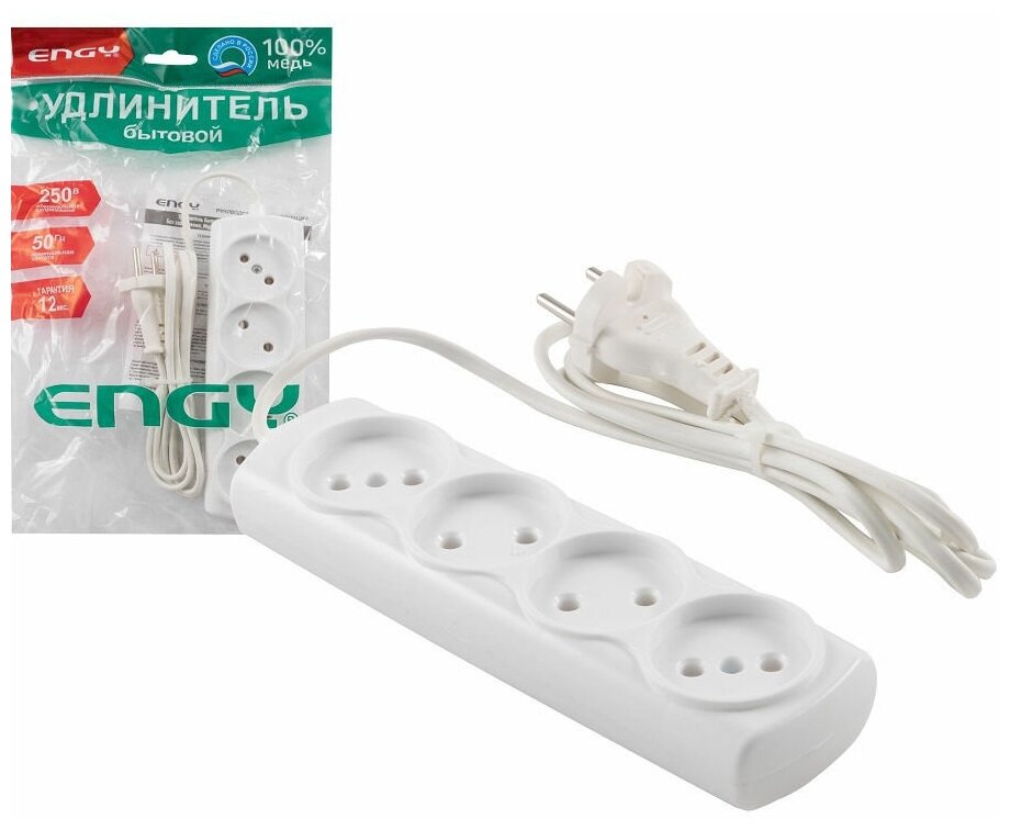 Удлинитель Engy Премиум 4 розетки, 4 розетки, б/з, 10А / 2300 Вт
