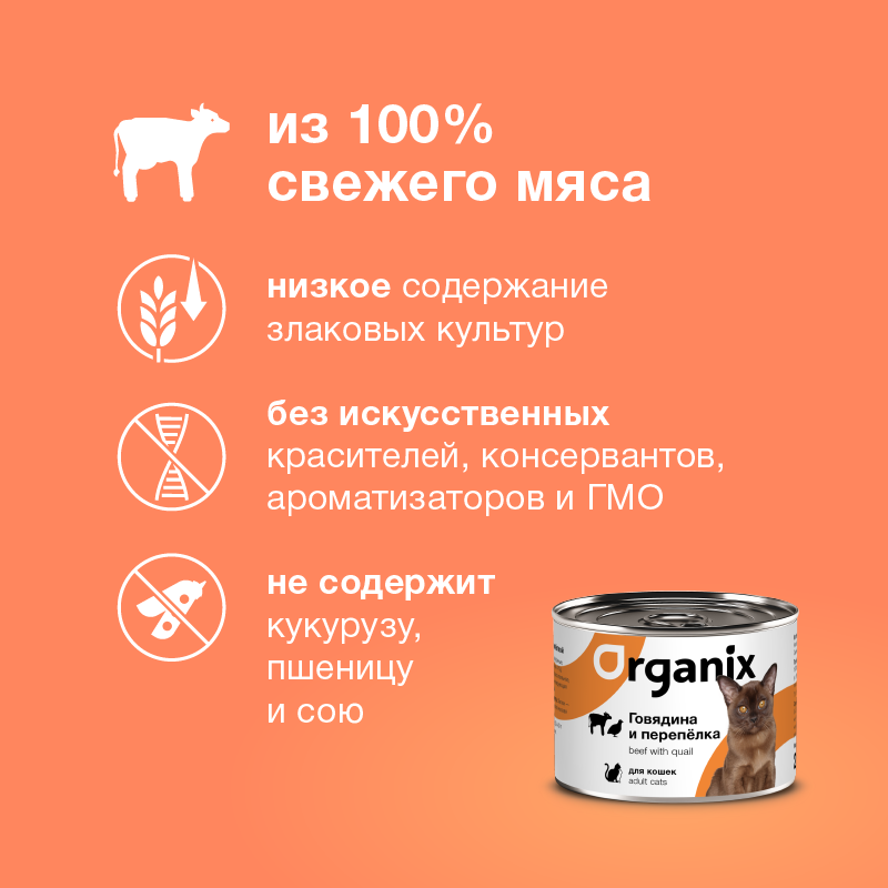 Влажный корм для кошек ORGANIX с говядиной, с перепелкой 100 г (паштет)
