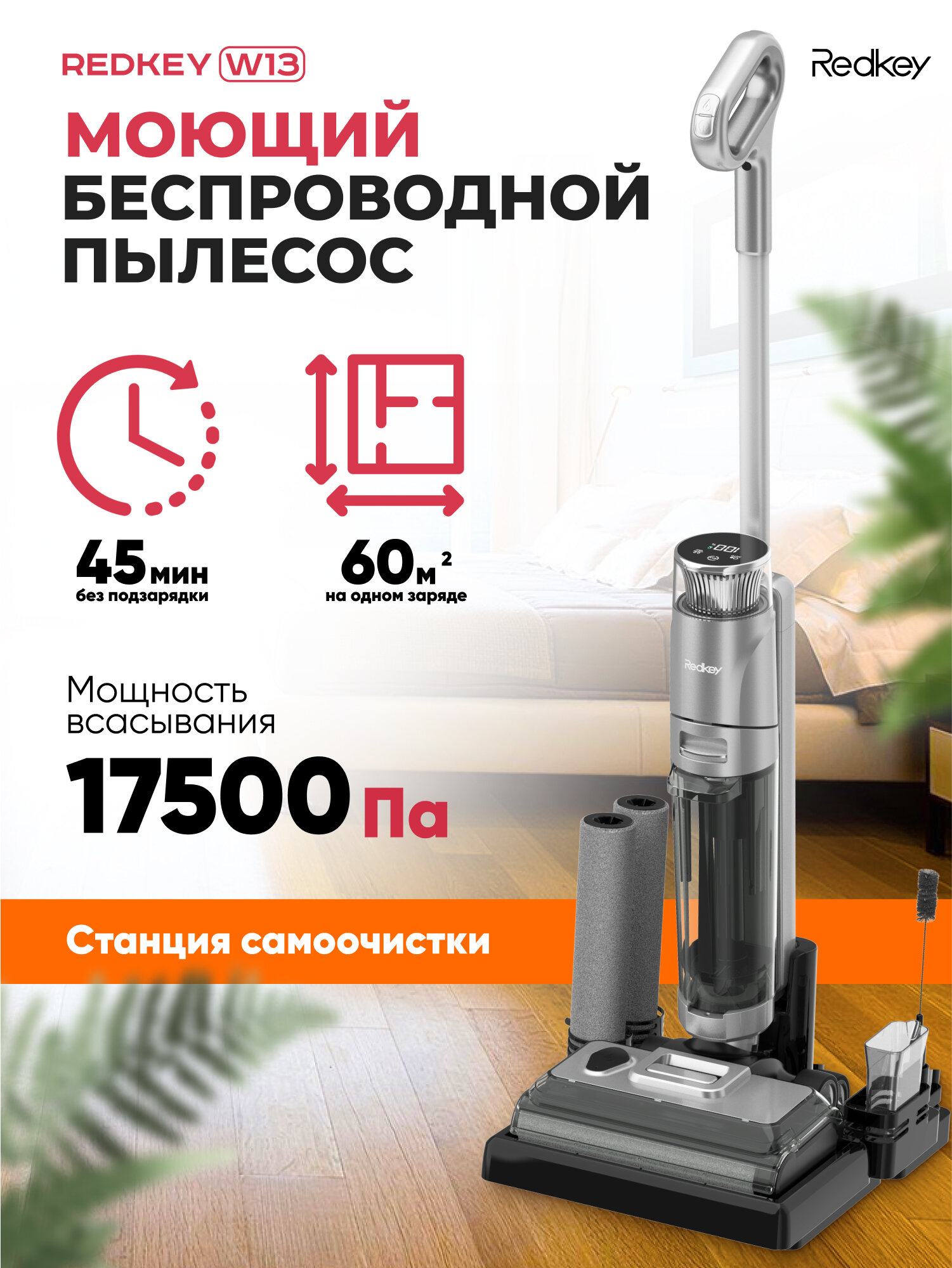 Моющий беспроводной пылесос Redkey W12 Pro с станцией самоочистки (Глобальная версия) 3 в 1 / мойщик окон / пылесос- химчистка мебели и тканей