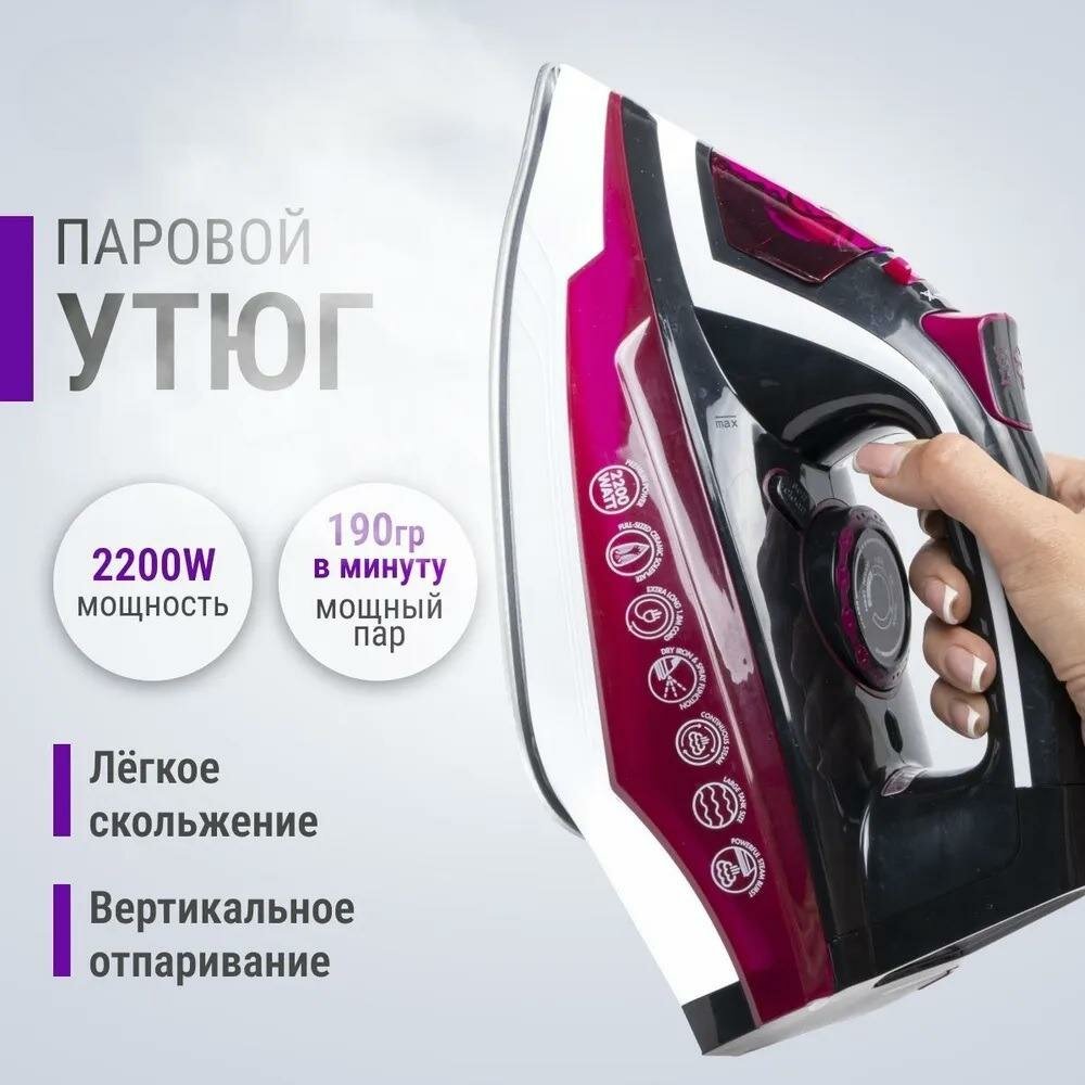 Утюг домашний, паровой,2200 Вт, керамическое покрытие, вертикальная глажка,"паровой удар", самоочистки, с защитой от перегрева информация: