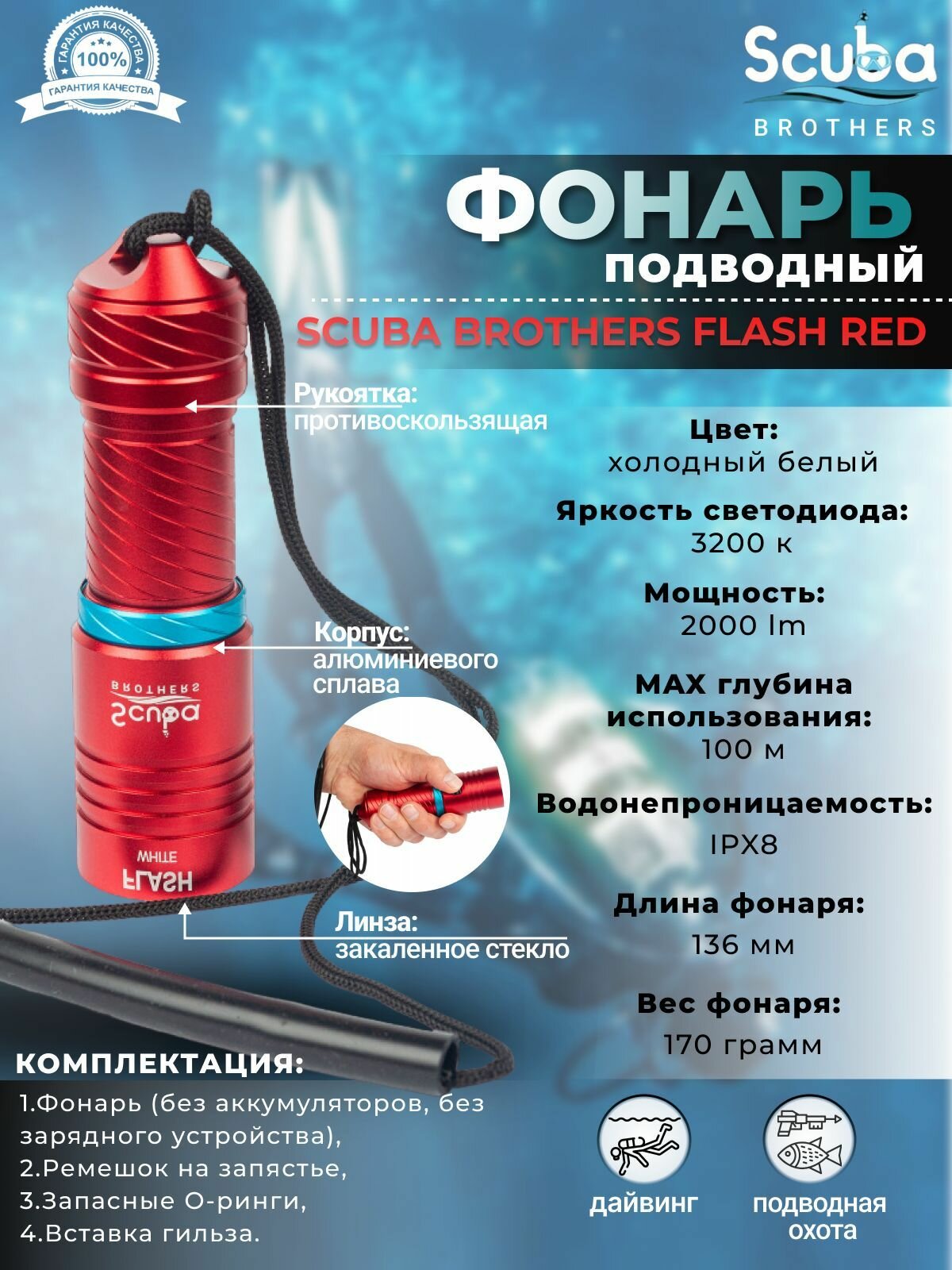 Фонарь SCUBA BROTHERS FLASH RED 2000Lm CREE XM-L L2, холодный белый свет информация:
