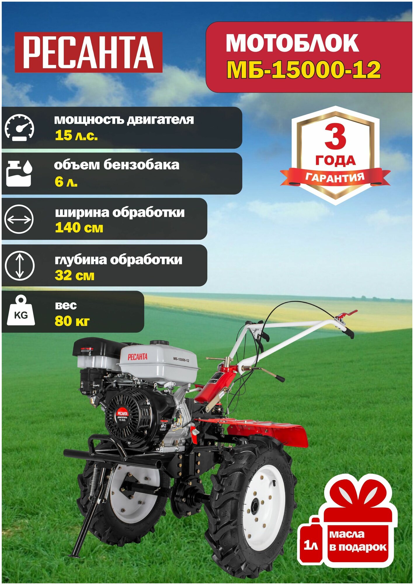 Мотоблок / Сельскохозяйственная машина Ресанта МБ-15000-12 (15 л.с., четырехтактный, бензин, бак – 6 л, ширина – 140 см)