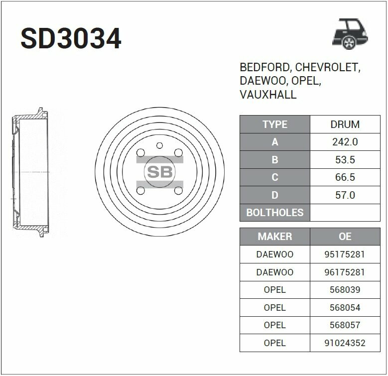 Барабан тормозной задний SD3034 для Daewoo Nexia/Espero 1994>/Lanos 1996>/Nubira 1997>. (D=242 мм)